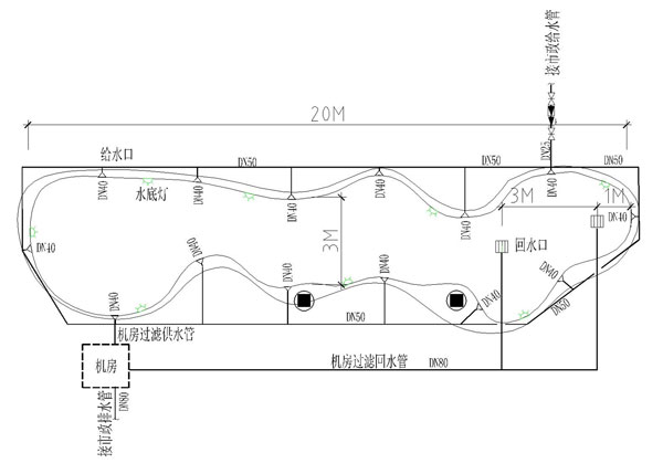 ⑦泳池補水與池底吸污相結(jié)合,吸池底出水可用來沖洗庭院,澆灌植物等,做到了節(jié)約用水。