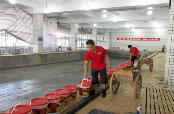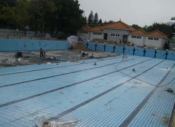 裝修施工前須對泳池蓄水48小時(shí)試驗(yàn),灌水后池壁外表面不得出現(xiàn)陰濕,每晝夜水量損耗小于每方2升,以檢驗(yàn)砼的抗?jié)B效果,確不滲漏,才進(jìn)行裝修施工,否則需采取措施,直至不滲水為止,再進(jìn)入裝修。