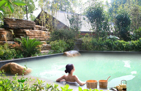 從室內的藥池出來,到室外的露天池,商家對池水的溫度進行了科學調控,有多種不同水溫的池子,剛從池水中出來,在秋夜的寒氣中感覺很冷,找了一個水溫較高的池子泡著,這個池子不大,只能容納十來個人。四周移栽有翠竹和常青樹。水池的石階邊有兩個出水孔,上面人工制成考究的石兌,不仔細注意看還難以發現,一個是地下溫泉,一個是地下冷泉,混合而成適合人體的水溫。池中的水總是流動著,一點都不渾濁,清澈見底。人入池中便碧波蕩漾,在燈光下,能清楚看到自己的腳趾頭。乳白色熱氣繚繞著飄向空中,感覺就是人間仙境。